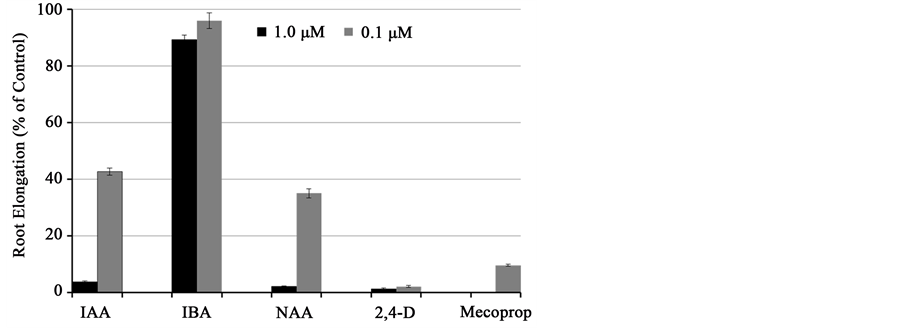 graphically (Figure 2). Roots were continuously exposed to the compounds in the MS media. At the low concentrations (0.10 µM) of the compound, inhibition of root elongation was in the following order: IBA < IAA < NAA < mecoprop < 2,4-D (Figure 3). Exposure to high concentrations (1.0 µM) of each compound resulted in a slightly different order of inhibition: IBA < IAA < NAA < 2,4-D < mecoprop. IBA at both concentrations caused the least root growth inhibition and the herbicides (2,4-D and mecoprop) were most inhibitory.