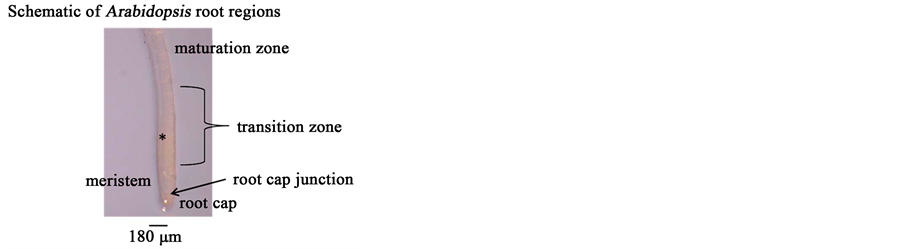 Figure 4. Schematic of Arabidopsis root zones. The 10 µL droplet of a test compound covered the entire root tip (maturation zone to root cap); asterisk denotes the region of FRET imaging.
