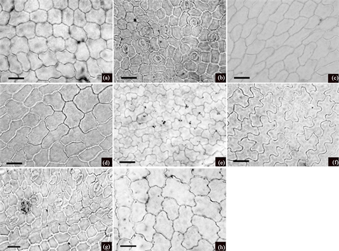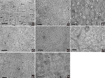 Figure 3. Characteristics of epidermal cells from Ligusticum species (light microscopy), all abaxial. (a) L. pseudodaucoides; (b) L. elatum; (c) L. reptans; (d) L. kingdon-wardii; (e) L. franchetii; (f) L. moniliforme; (g) L. rechingerianum; (h) L. sinense cv. Chuanxiong. Scale bar 50 μm.
