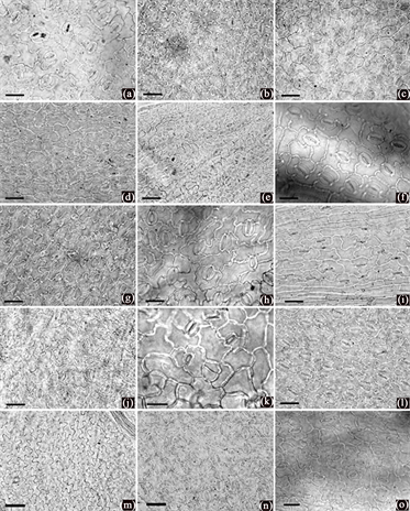 Figure 2. Characteristics of epidermal cells from Ligusticum species (light microscopy), all abaxial. (a) L. sikiangense; (b) L. mairei; (c) L. capillaceum; (d) L. multivittatum; (e) L. tenuisectum; (f) L. brachylobum; (g) L. tenuissimum; (h) L. yanyuanense; (i) L. mucronatum; (j) L. thomsonii; (k) L. nullivittatum; (l) L. discolor; (m) L. jeholense; (n) L. weberbauerianum; (o) L. ajanense. Scale bar 50 μm.