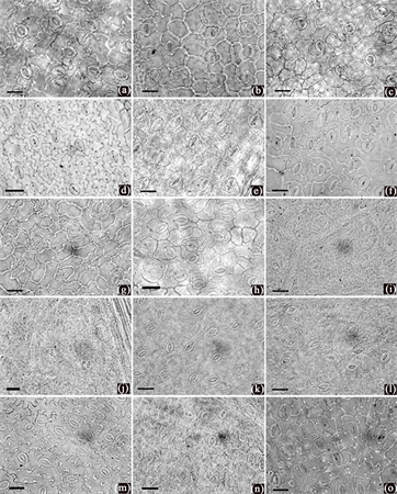 Figure 1. Characteristics of epidermal cells from Ligusticum species (light microscopy), all abaxial. (a) L. daucoides; (b) L. pteridophyllum; (c) L. litangense; (d) L. tachiroei; (e) L. hispidum; (f) L. nematophyllum; (g) L. sinense; (h) L. involucratum; (i) L. delavayi; (j) L. oliverianum; (k) L. likiangense; (l) L. littledalei; (m) L. acuminatum; (n) L. angelicifolium; (o) L. scapiforme. Scale bar 50 μm.