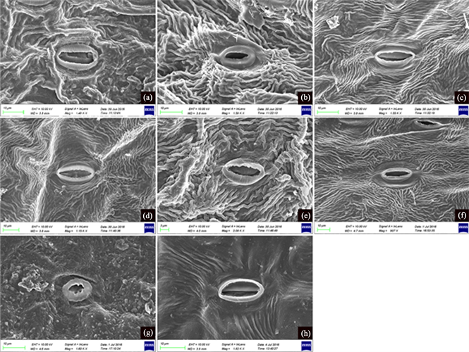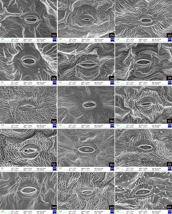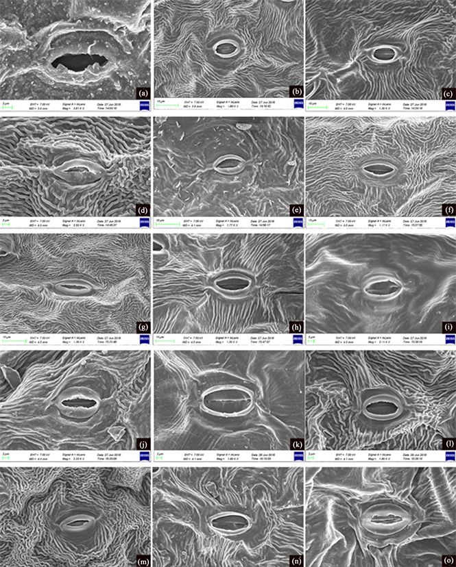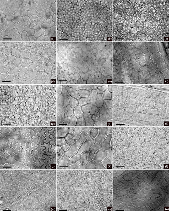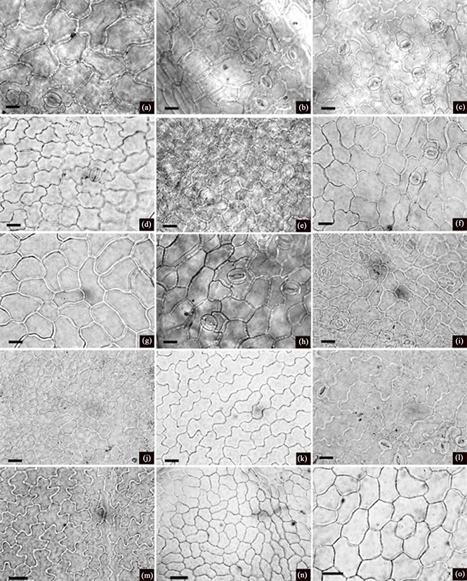 materials were identified by the first author using published keys. Mature leaves were investigated under light microscopy (LM) and scanning electron microscopy (SEM). To check the constancy of epidermal structure, at least five slides were made from different parts of a single leaf for each species. Materials for LM study were boiled in distilled water for 20 minutes before being macerated in 75% NaClO. Pieces of leaf epidermis were stained with Safranin solution (1%), and then dehydrated in an ethanol series (from 75% to 100%) before being mounted in Canada balsam. Materials for SEM were directly attached to stubs without any treatment. After gold sputtering, the specimens were examined and photographed under a Hitachi S-4800. Stomatal terminology was based on the classification proposed by Baranova [21] [26] and Wilkinson [27] .