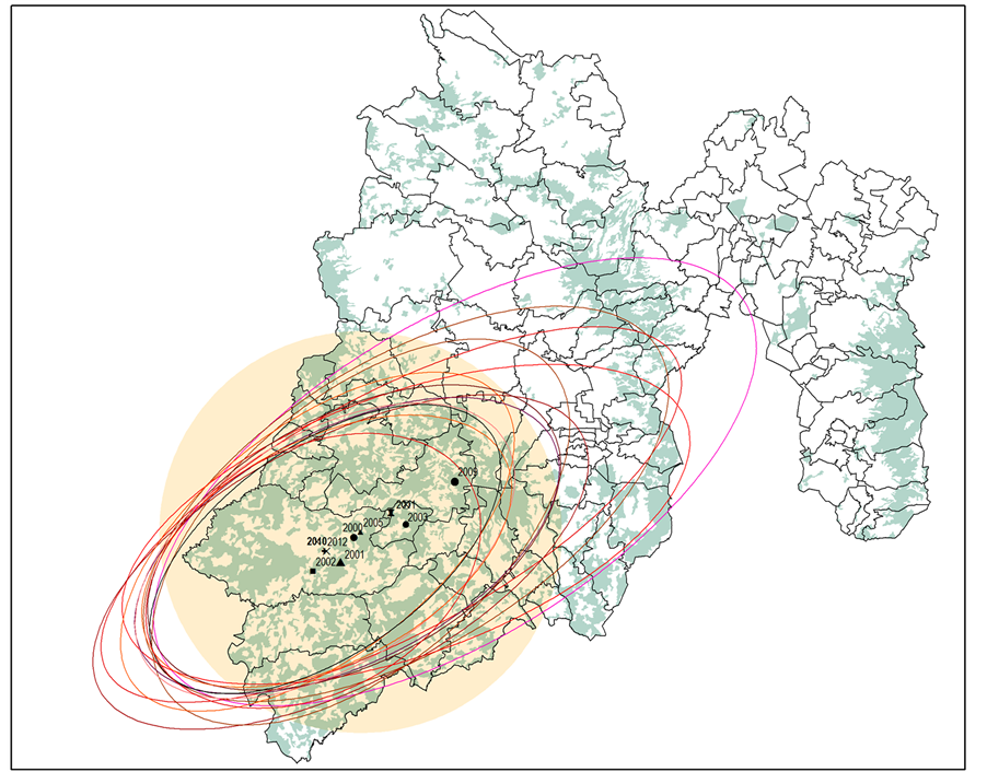 Figure 3. Mean central point and ellipse of dispersion for the burned forest areas in Mexico State 2000-20012.
