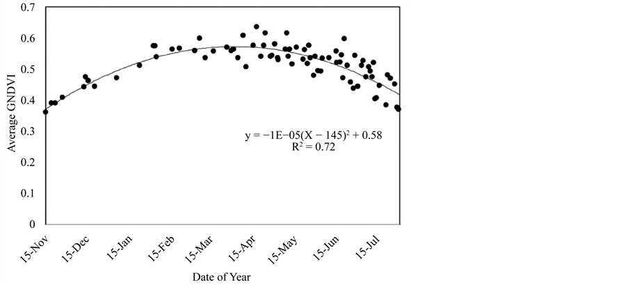 = 0.72. The vertex form of the model shown in Figure 3 indicates that the GNDVI value reaches to its peak after 145 days of starting date (15th November) and about three months before harvest. This result is consistent with the previous findings [30] [31] , whom reported that the best acquisition period of satellite images is about two months prior to the beginning of harvest for the prediction of sugarcane yield. The highest average GNDVI value from the model is 0.58.