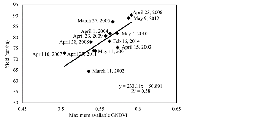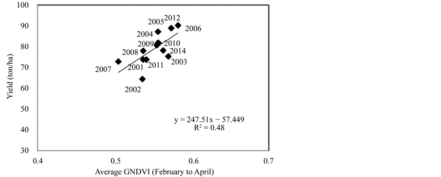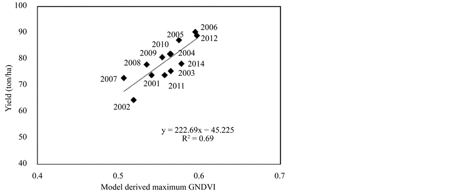 Linear regression analysis was performed to evaluate the relationship between the model derived maximum GNDVI value and sugarcane yield. The fifteen yield forecasts from 2001 to 2015 and yield observations at harvest were evaluated and compared using root means square error (RMSE).