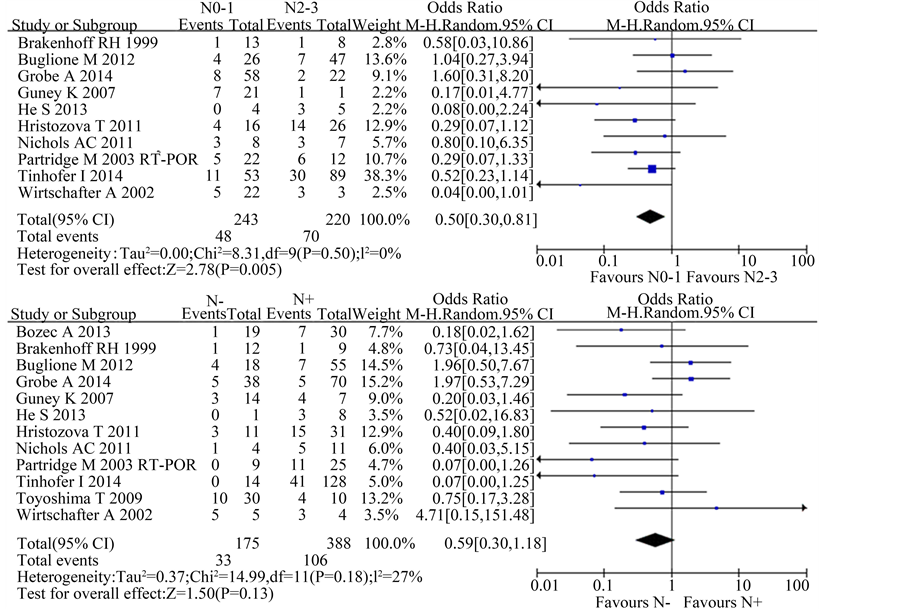 When considering N0-1 vs. N2-3, there were 10 studies included and the χ2 test showed no significant heterogeneity among the studies (P = 0.50; I2 = 0%). The result suggested that the presence of CTCs was significantly correlated with advanced N stage [OR 0.50, 95%CI (0.30, 0.81), n = 10, P = 0.005].