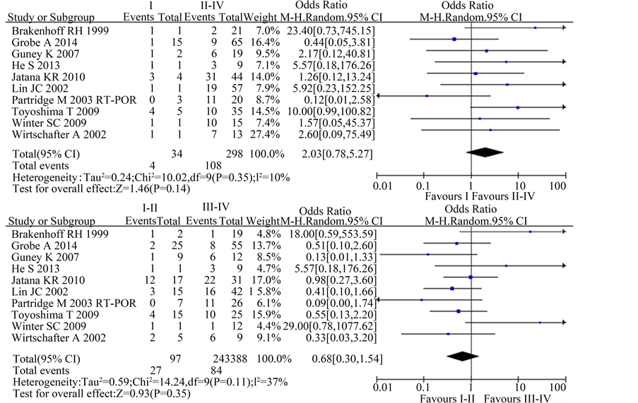 Figure 4. Estimated odds radios (OR) for total stage. (a) Forest plot of the relationship in I-II stage group relative to III-IV stage group; (b) Forest plot of the relationship in I stage group relative to II-IV stage group.