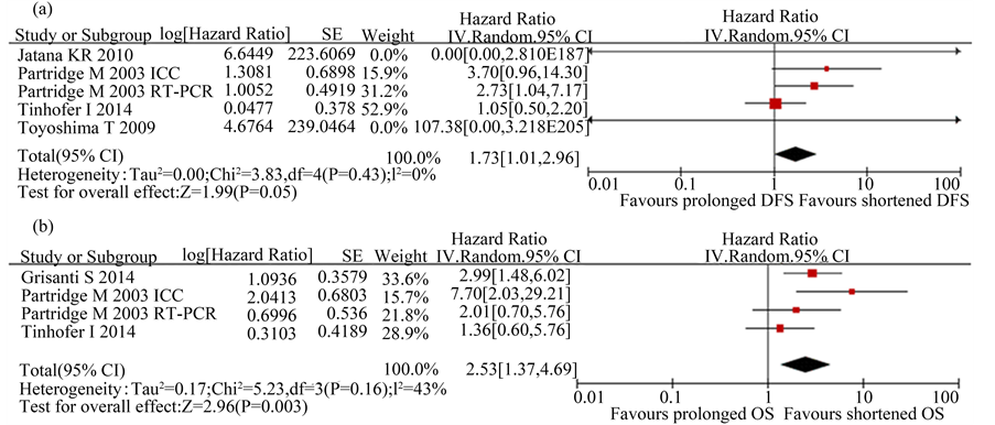 There were 5 studies presenting relationship between CTCs and DFS with only 1 study which gave the HR and 95%CI for DFS directly [11] , and other 4 studies with HR and 95%CI of DFS which were calculated using the survival curves and the P values [19] [21] [23] The χ2 test showed low heterogeneity among the above studies (P = 0.43; I2 = 0%). The combined pooled HR of the above studies by a random-effects model was 1.73 (95%CI 1.01 - 2.96, P = 0.050), indicating that high CTCs level was significantly associated with a poor DFS in patients with H&N cancer (Figure 5(a)).