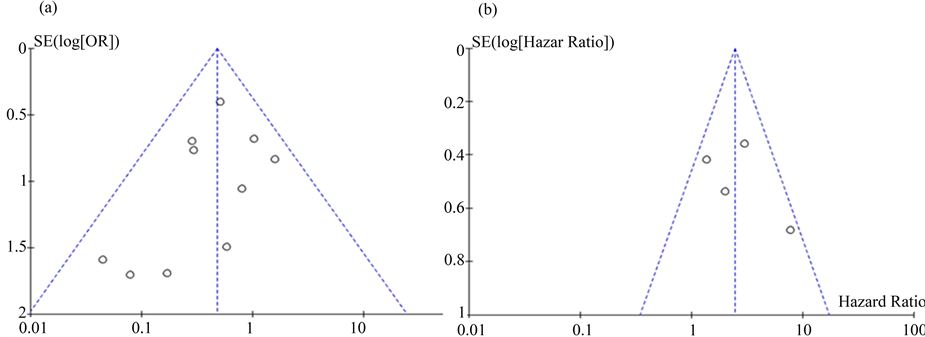 Figure 6. Funnel plots of the enrolled studies. (a) N stage; (b) Overall survival (OS).