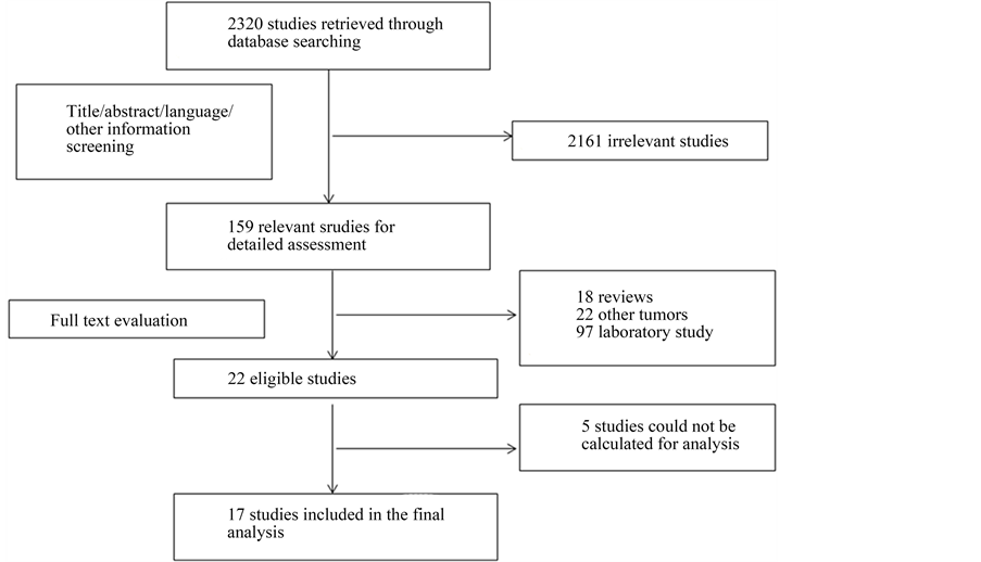 The primary literature research initially yielded 2320 articles. After screening the titles, abstracts, language and other information, 2161 studies were excluded and 159 potential studies were reviewed further. An additional 137 studies were then excluded which were reviews (n = 18), laboratory studies (n = 97) or studies of other tumors (n = 22). Upon detailed evaluation of the remaining 22 studies, 5 studies had to be excluded because the outcome of interest could not be calculated. Finally, a total of 17 articles were considered to be appropriate for the meta-analysis (Figure 1).