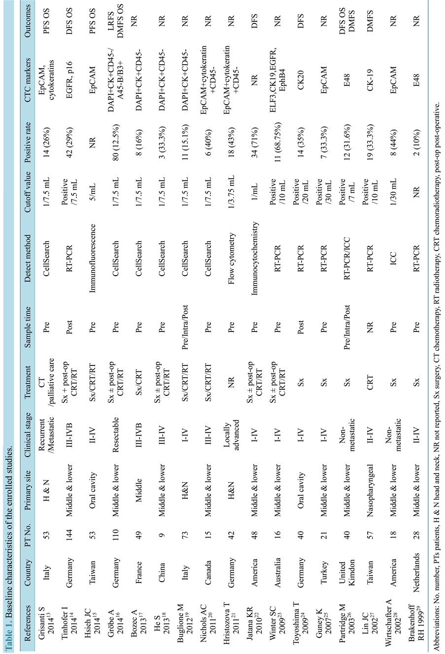 The prognostic significance of CTCs in H&N cancer has been controversial in a series of studies. In our enrolled studies, Grisantis S et al. prospectively reported that pre-treatment detection of CTCs was associated with poorer PFS and OS [10] . Controversially, Tinhofer I et al. showed that there was no correlation between post-operative CTCs positivity and overall survival [11] . This discrepancy between studies may be due to hete-
