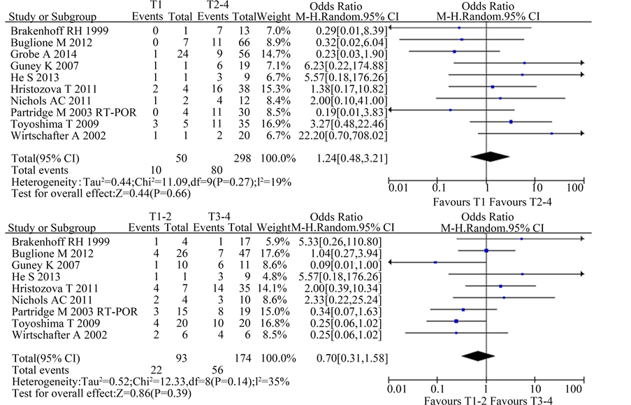 Figure 2. Estimated odds radios (OR) for T stage. (a) Forest plot of the relationship in T1 group relative to T2-4 group; (b) Forest plot of the relationship in T1-2 group relative to T3-4 group.