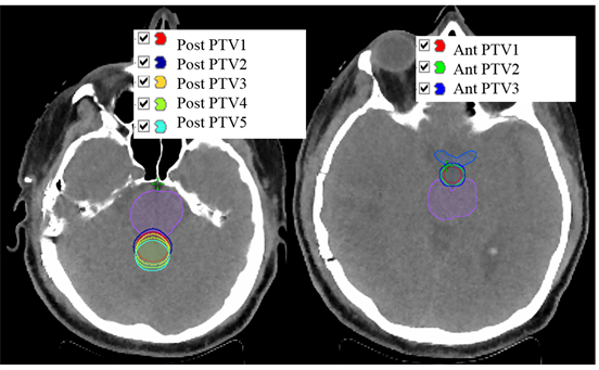 Figure 1. Simulated planning target volumes with incremental margins near organs at risk. “Post PTVs” (Left Panel) is located posterior to the brainstem. “Ant PTVs” (Right Panel) is located in between the optic chiasm and the brainstem.