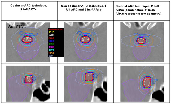 Table 4. Conformity Index (C.I.) and Gradient Measure (G.M.) comparison of coplanar (CP), non-coplanar (NCP) and coronal arc (cARC) planning techniques. Non-coplanar (NCP) technique has better C.I. and G.M. indices. Conformity Index (C.I.) for cARC is comparable to both NCP and CP. Gradient Measure (G.M.) for cARC resides in between NCP and CP but superior to CP.