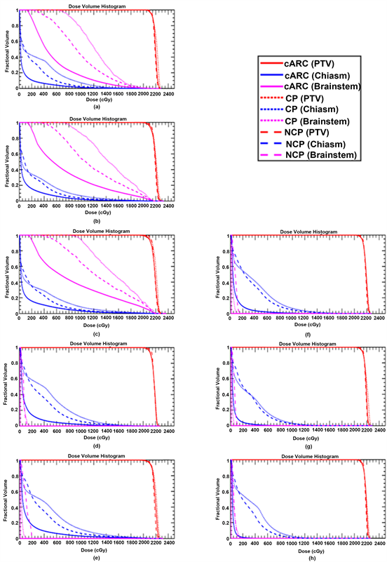Figure 5. Comparison of fractional volume vs dose to “Ant PTVs” and “Post PTVs”, Chiasm and Brainstem for coplanar (CP), non-coplanar (NCP) and coronal arc (cARC) techniques. Graph “a-c” are for “Ant PTVs” and “d-h” for “Post PTVs”. To represent a true comparison, all the plans were normalized equally. It clearly shows an improvement of dose reduction to brainstem and optical chiasm.