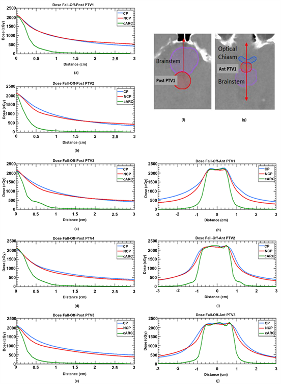 Dose volume histograms (DVHs) comparing all three approaches are shown in Figure 5. Comparing cARC with CP, the D50 and D30 of brainstem was reduced by 85.1% ± 3.9% and 87.6% ± 3.2% for “Post PTVs”, by 51.1% ± 17.8% and by 85.6% ± 6.0% for “Ant PTVs” (p ≤ 0.01). For chiasm, the reductions were 61.7% ± 3.2% and 44.2% ± 8.9% for “Ant PTVs”, and 69.3% ± 8.0% and 74.3% ± 8.2% for “Post PTVs” (p ≤ 0.01). When comparing cARC with the NCP technique, D50 and D30 of brainstem were reduced by 80.9% ± 3.3% and 84.6% ± 4.8% for “Post PTVs”, by 74.4% ± 4.8% and 79.6% ± 6.6% for “Ant PTVs” (p ≤ 0.01). In addition, for chiasm reductions were 49.9% ± 2.6% and 34.8% ± 8.2% for “Ant PTVs” and by 84.8% ± 2.9% and 86.7% ± 2.5% for “Post PTVs” (p ≤ 0.01). Profiles of the dose fall-offs for all 3 techniques which were drawn at the center of “Ant PTVs” and anterior to “Post PTVs” are shown in Figure 6.