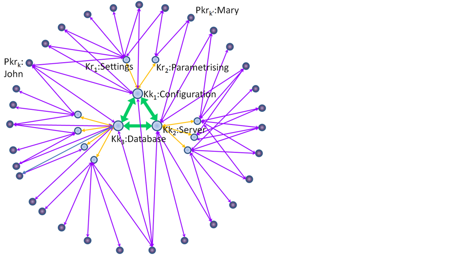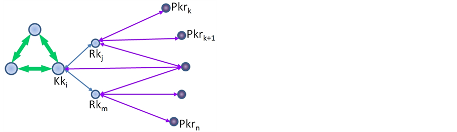 In our current experimentations as in Figure 1, a skills network on demand comprises three types of nodes and four types of relationships8. The nodes are either of a type (1) keyword-Key knowledge (Kk), (2) term associated to keyword-Relative knowledge (Rk) or (3) People (Pkr).