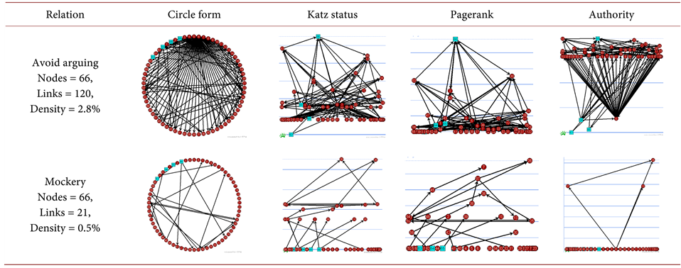 densest (2.8%) while this of mockery relations is the less dense one (0.5%). This is understandable, as the avoiding argumentation is an easy solution in the everyday life in order to restrict misunderstanding and conflicts. On the other hand, mockery is normally practiced only among people familiar to each other and not from all to all. Thereby, it remains a quite rare relation within a group. Beyond density, the Katz, pagerank and authority have been depicted. Particularly, the authority of avoiding argumentation is a quite peculiar and unusual one, as it clearly obtains the structure of inverse pyramid. This is understandable as most nodes tend to posses the “distinct” position in avoidance.