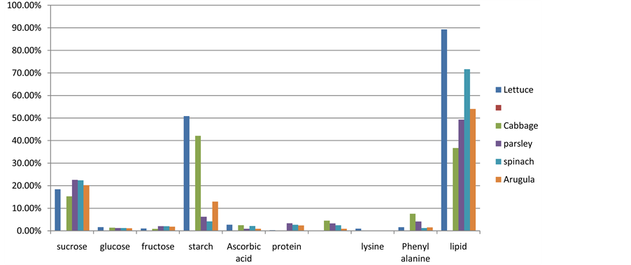 The lipid, starch and sucrose were the most nutrient values in green leafy vegetables that were chosen (lettuce, cabbage, parsley, spinach and arugula) and the fructose, glucose and ascorbic acid were the least. The lettuce is the leafy vegetable that has most nutrient values and the least one is arugula.