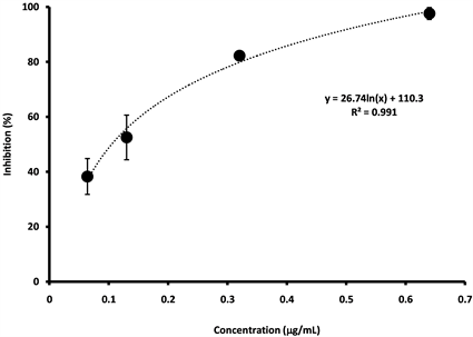 Figure 1. α-Glucosidase-inhibition curve obtained from the extract from Chry. IC50 calculated from the equation inserted in this figure was 0.41 (μg/mL).
