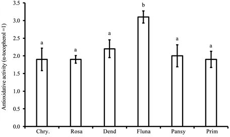 Figure 2. Anti-oxidative activity of the extracts from 6 edible flowers. a, b: different letters are significantly different in each other (Scheffe’s test, p < 0.01).