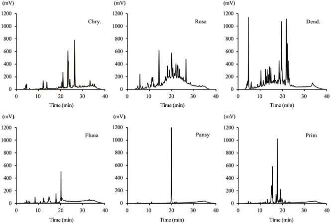 Figure 3. HPLC chlomatograms obtained from each sample. Concentration of the samples applied into HPLC were 4.6 mg/mL (Chry.), 0.46 mg/mL (Rosa), 3.2 mg/mL (Dend.), 0.6 mg/mL (Fluna), 0.24 mg/mL (Pansy), and 0.38 mg/mL (Prim.), respectively.