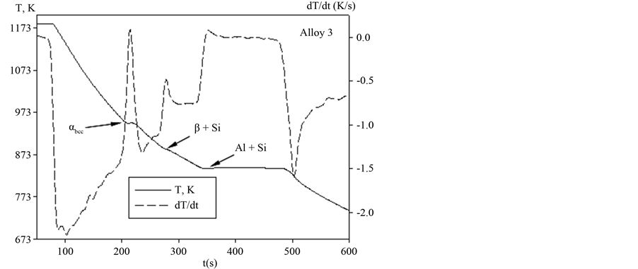 The cooling curve obtained for the alloy 3 clearly reveals three slope changes during solidification process, as is shown in Figure 5. Based on microstructural analysis, the first slope change observed is related with the formation temperature of αbcc-AlFeMnSi phase (hereinafter abbreviated as αbcc). For the second slope change, the possible reaction indicates the formation of β-AlFeSi and silicon particles. The β phase was not analyzed by XRD due to the small amount formed in the isothermally-treated samples and the fact that it was mixed with the previously formed αbcc phase; however, it was identified as β phase based on its typical morphology reported in literature data [25] . Finally, the third slope change is related to the eutectic reaction that is the last to solidify.