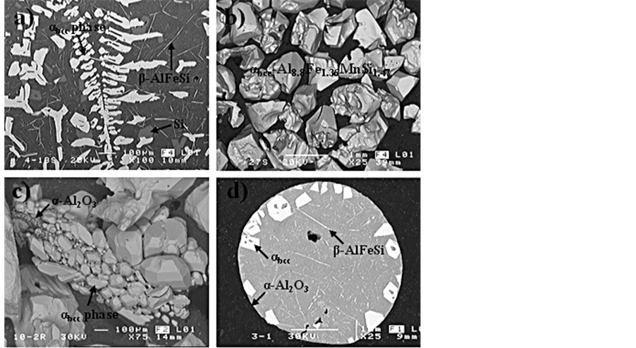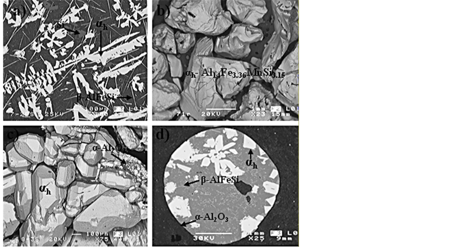 According to the Mn content of the studied alloys could be expected the formation of MnO·Al2O3, Mn2O3, or MnO·SiO2 particles, however, the presence of these oxides was not detected by X-ray diffraction, as can be seen in Figure 8. Another effect that could be expected is that Mn content had an effect on the alumina transformation from γ-Al2O3 to α-Al2O3, nonetheless, according to the experimental XRD pattern of the α-Al2O3, shown in Figure 8, such effect was discarded for the studied temperature range. Thus, it was thought that Mn content just become embedded in the solidification of the αsc, αbcc and αh phases. This observation is in accordance with some research [4] [24] , that suggest that many ternary AlFeSi intermetallics can accept Mn atoms into solid solution, which reflects the fact that Mn atoms may replace the Fe atoms in their crystal structure. Finally, it is important study whether the Fe-rich intermetallic phases can nucleate at all without the presence of oxide films in aluminum melts. This important question is not easily answered because obtaining aluminum melts free from oxide films remains difficult.
