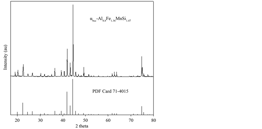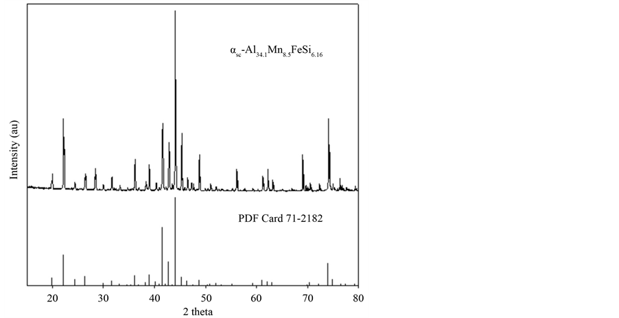 The intermetallics extracted from the isothermally-treated samples of alloy 1 (see Figure 3(c)), were analyzed by XRD. As can be observed in Figure 4, all peaks correspond to the Al50Mn12Si7 phase (JCPDS card number 71-2182); this phase exhibits a simple cubic (sc) crystal structure with a Pm3 space group [23] . In this work, however, according to the EDS data given in Table 2, the extracted intermetallic actually corresponds to the αsc-Al34.1FeMn8.5Si6.16 formula, with a Fe/Mn weight ratio of 0.12, and a total concentration of transition metals (Fe + Mn) of 32.4%. In comparison, in Figure 4 are shown the XRD pattern of the Al50Mn12Si7 phase and the experimental XRD pattern of the αsc-Al34.1FeMn8.5Si6.16 phase. It is observed that both patterns show similar peaks, in some cases the peaks intensity and the 2θ angles change in a little extent. This behavior has been attributable to the substitution of manganese atoms by iron atoms [4] [24] in the lattice sites of the crystal structure. Similar results were observed for the αbcc and αh-AlFeMnSi phases, shown in the following paragraphs.