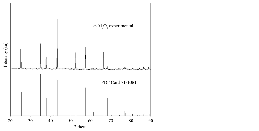 XRD results also shown the presence of α-Al2O3 in the powder produced by grinding the extracted particles from alloys 3 and 4, the last described in the following paragraphs. As observed in Figure 8, all peaks of the experimental XRD pattern of the α-Al2O3 were indexed according to the JCPDS card number 74-1081, which corresponds to the α-Al2O3 with a hexagonal crystal structure and R-3c space group [27] . It is worth mentioning that the alumina sample was obtained by separating α phases and alumina particles from particles like those observed in Figure 6(c) and Figure 10(c). Such α-Al2O3 particles have been thought to originate during casting of the melt into the graphite crucible and subsequent melt superheating at 900˚C.