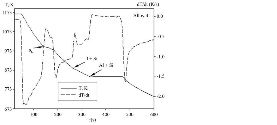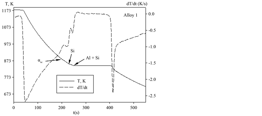 To determine the solidification sequence and the onset reaction temperature, Tp, for the intermetallic phase formation (see Table 2), thermal analysis curves were obtained by employing an experimental device similar to the one used by Bäckerud et al. [5] . First, the alloy was melted and heated to 800˚C under ambient air conditions in a gas furnace. Subsequently, the melt was poured into a graphite cup having a wall thickness of 6 mm, which was preheated to 900˚C in an electric furnace; to achieve thermal equilibrium conditions, the melt was kept at 900˚C for 120 s in the graphite cup inside the electrical furnace. Finally, the sample was cooled down to room temperature at a rate of ~1˚C/s.