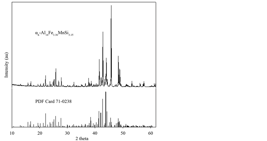 The intermetallic particles extracted from isothermally-treated samples of alloy 4, were analyzed by XRD. As observed in Figure 11, all peaks of the experimental XRD pattern were indexed according to the JCPDS card number 71-0238, which corresponds to the Al167.8Fe44.9Si23.9 phase. This phase exhibits a hexagonal crystal struc- ture, and belongs to the P63/mmc space group [28] . In this work, however, the chemical composition of the extracted intermetallic corresponded to the αh-Al14Fe3.36MnSi3.15 formula according to Table 2. EDS data of the αh phase revealed that the total concentration of transition metals (Fe + Mn) in the αh phase fell in the range of 33.3% - 34.2%. The Fe/Mn weight ratio was in the range of 3.41 - 4.22 for the extracted αh phase so can be es-