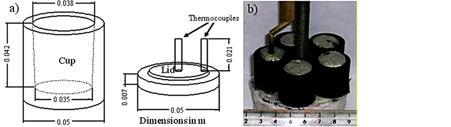 Figure 1. (a) Schematic illustration of the graphite cup and lid used to carry out the thermal analysis experiments; (b) Experimental setup used for the isothermal treatments.