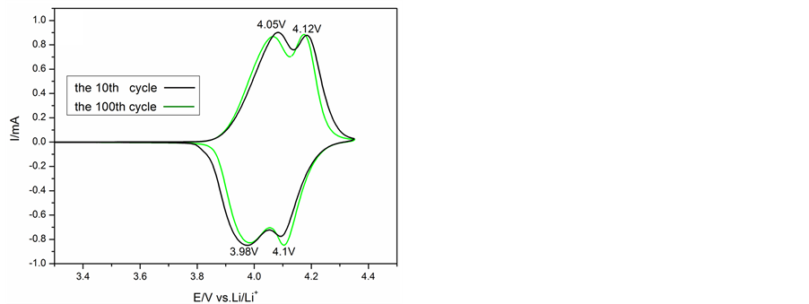 Figure 8 shows the CV profiles of pristine and LiNi0.5Mn1.5O4-coated LiMn2O4 electrodes in the 10th and 100th cycles at the scan rate of 0.1 mV∙s−1. The CV peaks of LiNi0.5Mn1.5O4-coated sample show two symmetrical couples of redox peaks at around 3.98 and 4.1 V respectively (Figure 8(b)), indicating that electrochemical insertion and extraction reactions of Li+ ions are two step processes. It is in agreement with the two plateaus in Figure 6 and demonstrates that LiNi0.5Mn1.5O4 coating does not change the electrochemical reaction mechanism of LiMn2O4. After 10 cycles, two narrow and separate redox peaks appear around at 3.96 and 4.11 V, as shown in Figure 8(a). However, after 100th cycles, due to the dissolution of Mn3+ ions into the electrolyte