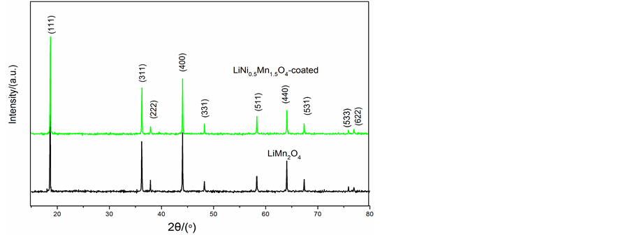 LiMn2O4 powder was purchased from Heibei Strong-Power Li-ion Battery Tecnology Co. Ltd (D98, China). To coat LiMn2O4 with LiNi0.5Mn1.5O4, LiCH3COO∙2H2O (0.558 g), Mn (CH3COO)2∙4H2O (2.011 g) and Ni (CH3COO)2∙4H2O (0.68 g) with a stoichiometric ratio (2:1:3) were dissolved in distilled water to form a clear solution. An aqueous solution of ethylene glycol and citric acid as a chelating agent was added to the mixtures. pH value at 6.5 - 7.0 was achieved by Ammonium hydroxide. Then the LiMn2O4 powders (50 g) were slowly added to the sol and vigorously stirred at 85˚C for 8 h. As the evaporation of water proceeding, the sol was turned into a viscous transparent gel. After drying and sieving, the powder was sintering in air at 400˚C for 10 h and 750˚C for 3 h to obtain LiNi0.5Mn1.5O4-coated LiMn2O4. For a comparison, pristine LiMn2O4 was also heat- treated in the same condition.
