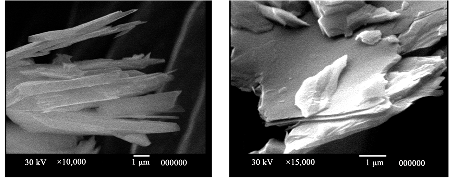 Figure 6. SEM photographs of Shalatine talc concentrate. (a) Needle-like crystals of talc; (b) Talc blades arranged in sheet structure.