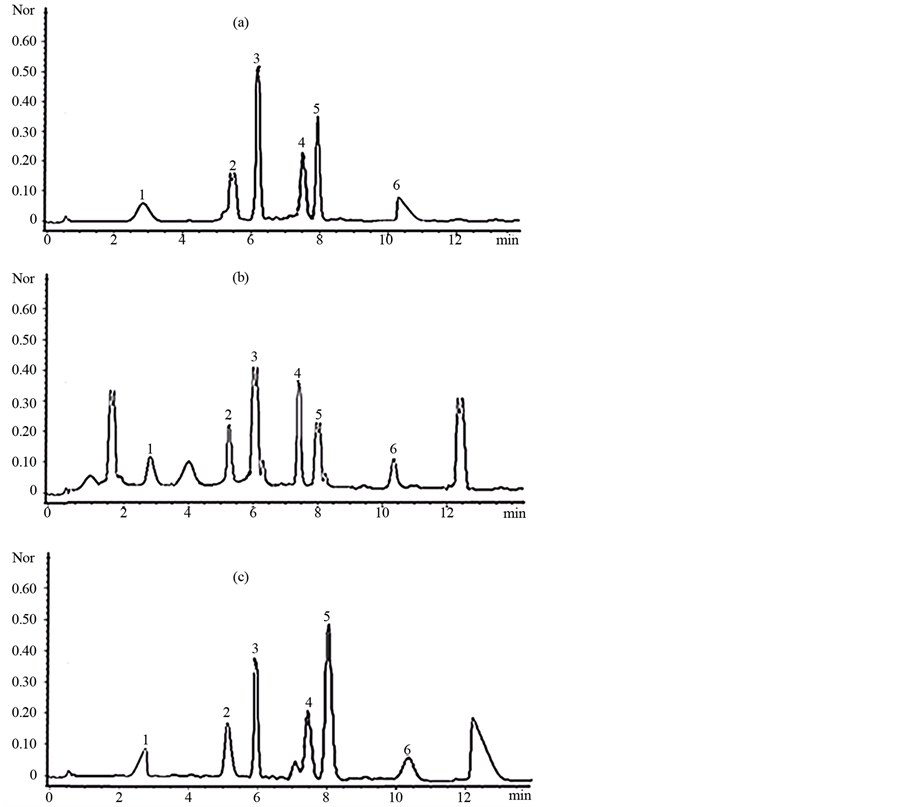 Figure 2. HPLC organic acids profile of extracts of three Russula species mushroom from Côte d’Ivoire ((a) R. delica, (b) R. lepida and (c) R. mustelina). Detectionat 210 nm: (1) oxalic acid; (2) ascorbic acid; (3) fumaric acid; (4) citric acid; (5) malic acid; (6) succinic acid.