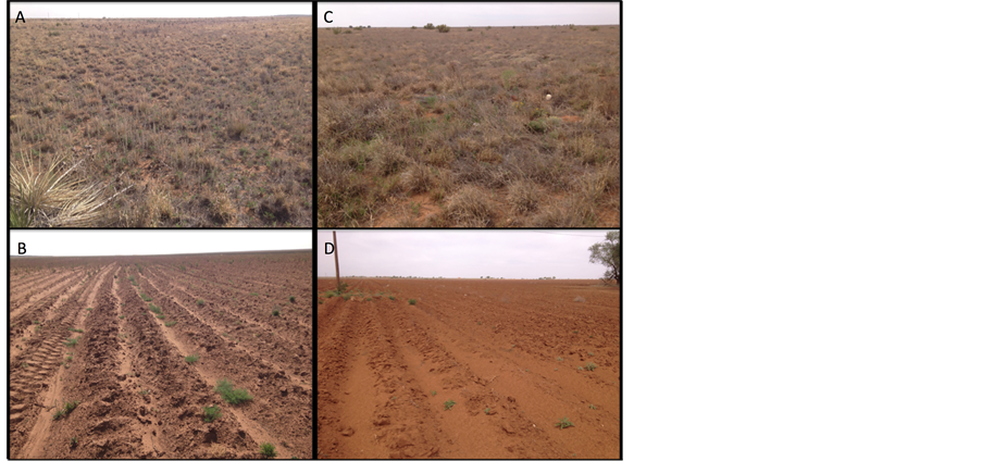 Two sites were chosen for this study with similar soil types and with more than 24 years under CRP contract. One site was in Lynn County TX where the soil was an Amarillo (Fine-loamy, mixed, superactive, thermic Aridic Paleustalfs) soil series that spanned across both the dryland and CRP fields (Figure 1(A) and Figure 1(B)) located 17.3 km west of Tahoka TX. This site has been under CRP for 24 years enrolling in 1992. The second site was located in Terry County TX also classified as an Amarillo soil series that spanned from a dryland field across a road into an adjacent CRP field (Figure 1(C) and Figure 1(D)) located 12.5 km east of Brownfield TX. This site enrolled in CRP in 1985 and thus has been under CRP management for 31 years.