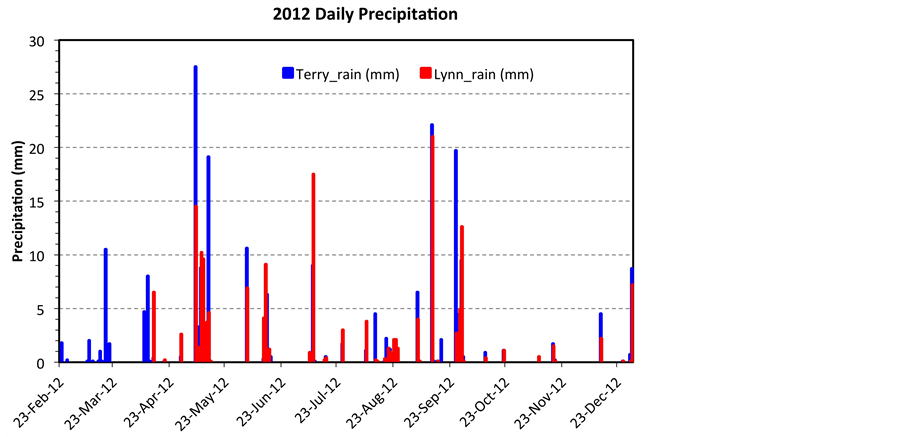 Figure 2. Daily rainfall amounts (mm) measured at Terry and Lynn County locations from February to December 2012.