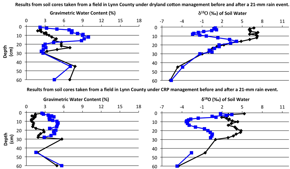 Infiltrometers measure the infiltration rate but do not account for runoff. However, using stable isotopes of water allows tracking the depth of infiltration of the rainwater and comparing runoff to adjacent fields, i.e., CRP vs. bare soil. The objective of this study was to investigate the feasibility of using stable isotopes of water to measure the depth of infiltration of rainwater for a soil series (Amarillo Fine Sandy Loam) under dryland cotton production and CRP. The fields under these two management practices were adjacent to each other and were selected to minimize variability in rainfall between the two sites.