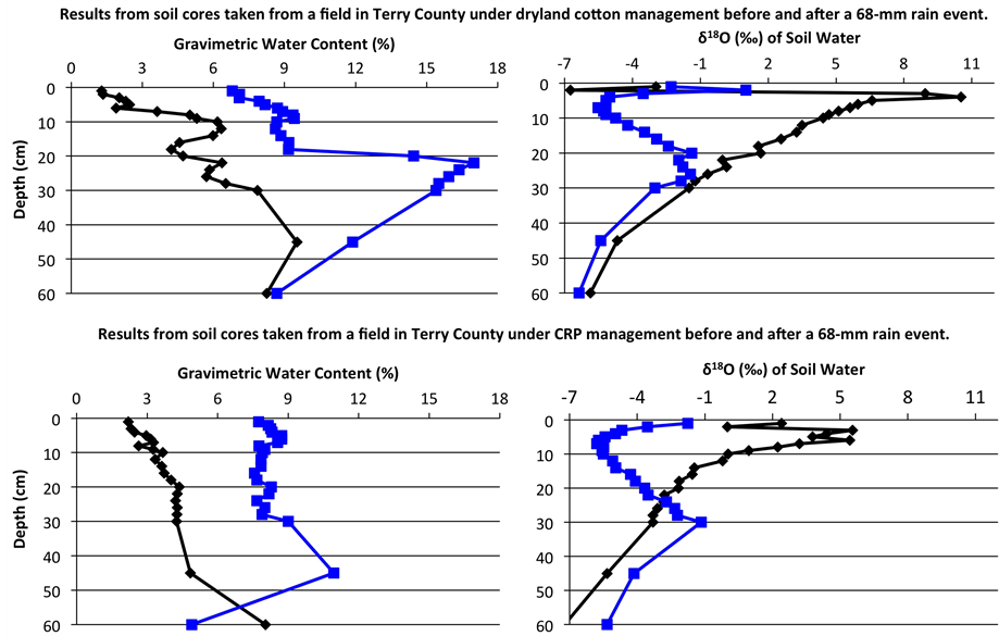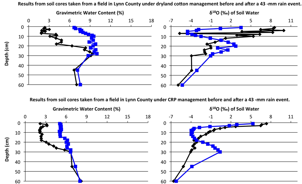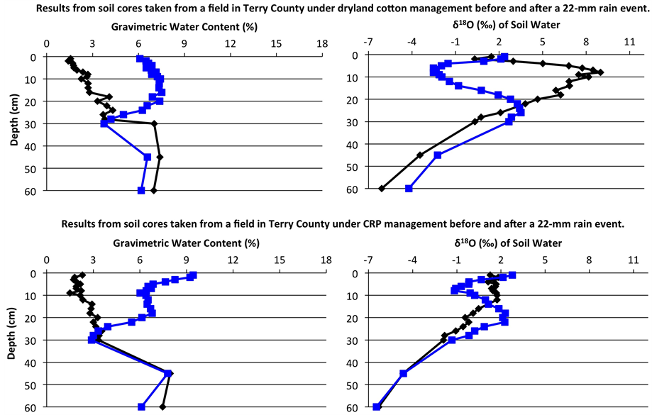 Figure 6. Measured soil gravimetric water content and water isotopic data for dryland and CRP fields in Terry County to a depth of 0.6 m before the 20 April 2012 (Black) and after the 17 May 2012 (Blue). During this period a 68-mm rain event was measured at the site.