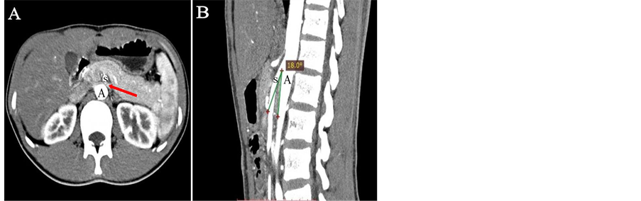 Figure 2. CTA shows the relationship of SMA (S), aorta (A) and LRV (arrow) in coronal (A) and sagittal (B) planes in this patient. (A) LRV is compressed when it crosses between aorta and SMA. (B) SMA compresses LRV with initial steep caudal descent with aorta at the angle of 18˚.
