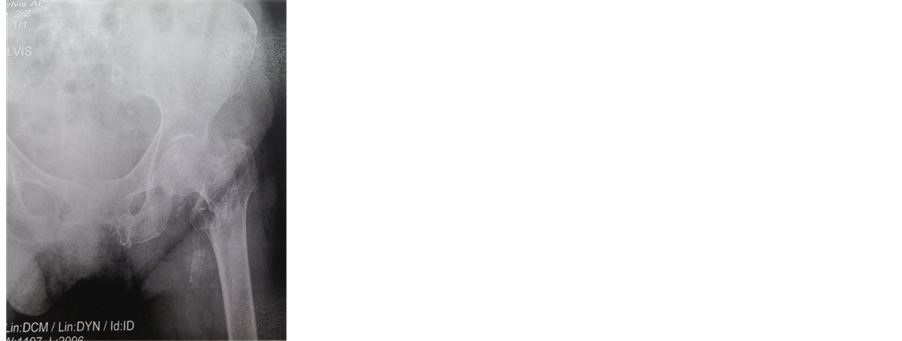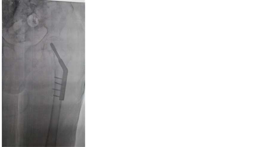 Postoperatively she stayed 14 days in the hospital and the hip pain significantly improved. Second day postoperative was initiated a recovery plan, including placing on bedside. Partial weight bearing on the left was initiated on the third day postoperative and maintained for the first 6 weeks. At 45 days the radiographs showed no loss of fixation and the patient walked with walker suport and the HHS (Harris Hip Score) was 66. At 4 months the radiographs showed union of the left hip fracture and the patient walked with a cane and the HHS was 74. The HHS (Harris Hip Score) was 78 at one year, growth potential in the coming months, which we consider a good score for patient age.