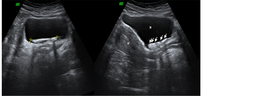 Figure 2. Axial and sagittal trans abdominal ultrasound images shows dense intra bladder stone like lesion with metallic artifact (arrows), (U) uterus, (B) bladder.