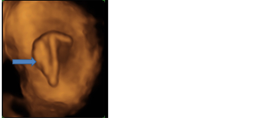 Figure 3. Three dimensional ultrasound image, elegantly demonstrates intra bladder IUD and its calcified component (arrow).