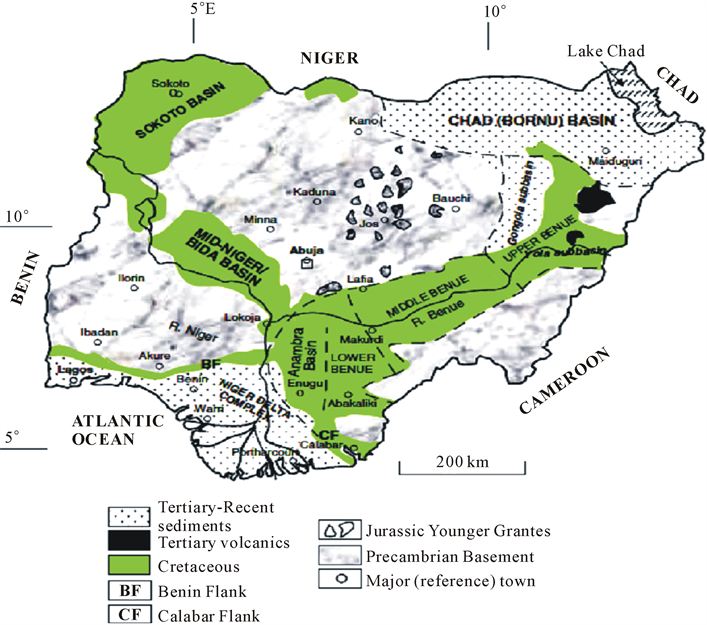 The Geology of Nigeria according to Obaje [9] is made up of three major geological components (Figure 2); 1) Basement Complex which is Precambrian in age (>+600 million years), 2) Younger Granites i.e. Jurassic (200 - 145 million years) and 3) Sedimentary Basins i.e. Cretaceous to Recent (<145 million years). Nearly one half of the country is underlain by basement complex including the younger granite while the other half comprises of the sedimentary terrain [10] . The basement complex of Nigeria forms a part of the Pan-African mobile belt and lies between the West African and Congo cratons and south of the Tuareg shield [11] . It is intruded by the