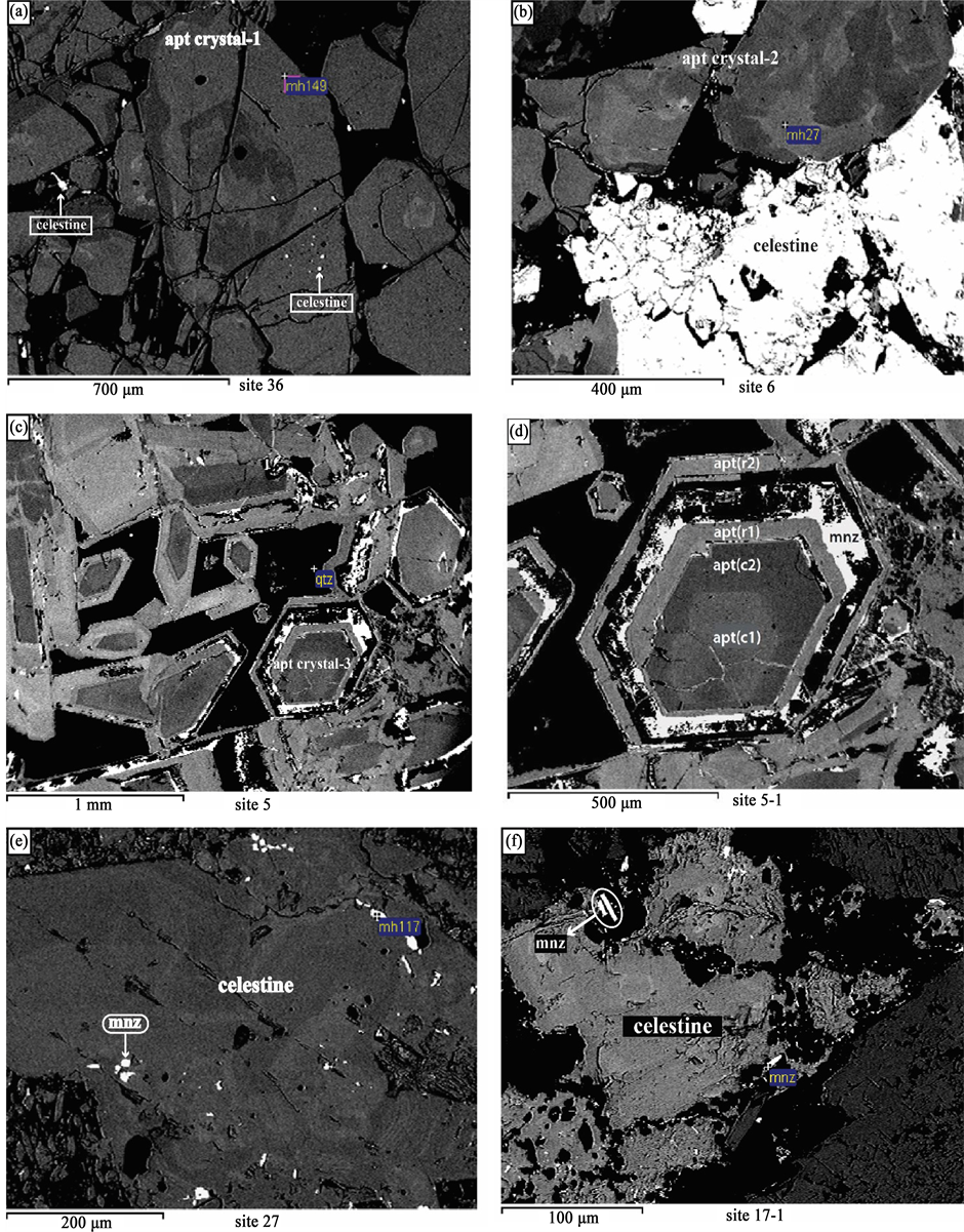 Figure 3. (a) Euhedral apatite crystal-1 from apatite zone and celestine inclusions associated with apatite crystal; (b) Subhedral apatite crystal-2 from apatite zone and celestine. Apatite crystal-2 can be discern to dark and light areas; (c) Euhedral apatite crystal-3 associated with monazite grains; (d) Apatite crystal-3 can be discern to core1 (c1) moderate, core2 (c2) dark, and rim1 (r1), rim2 (r2) light areas. Monazite grain occurs between rim1 (r1) and rim2 (r2); (e) Subhedral very fine-grained monazites associated with Celestine; (f) Elongated euhedral very fine grained two monazite grains associated with celestine.
