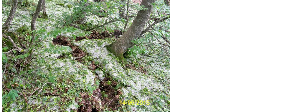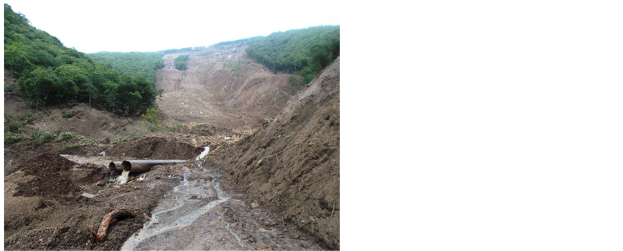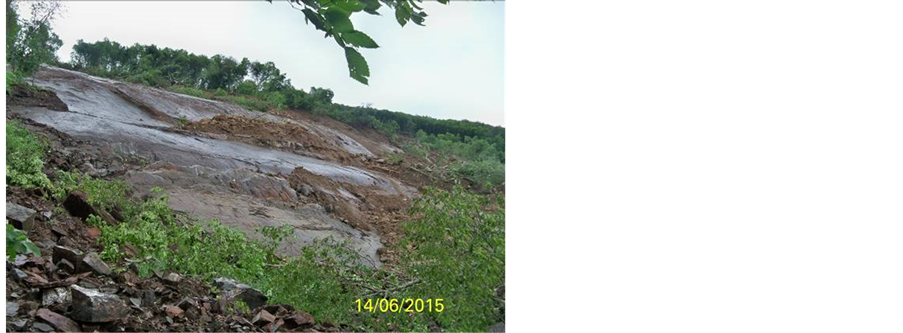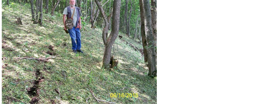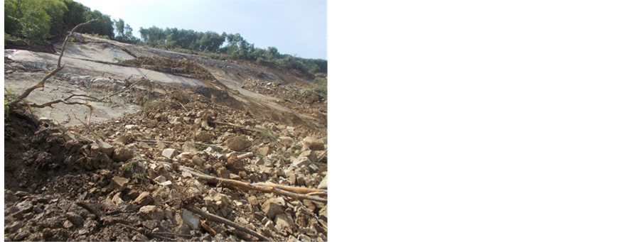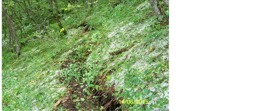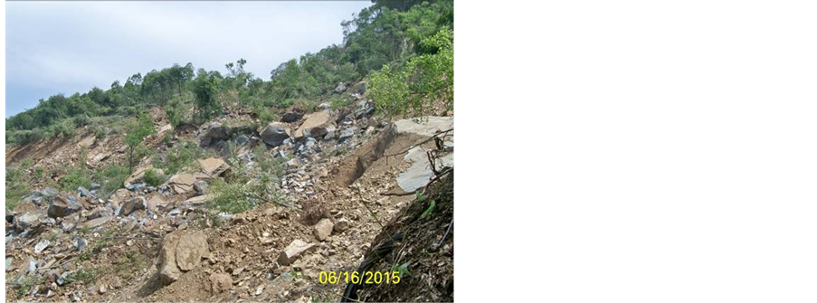 Adjacent to the East wing of the landslide there are three landslide fractures of East- West direction developed with the length of 20 - 30 meters, and the width of it is from 0.5 to 1.0 meters and with the visual depth from 0.2 to 1 - 1.5 meters (Figure 7 and Figure 8).