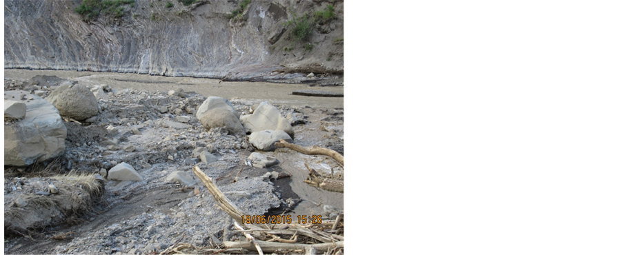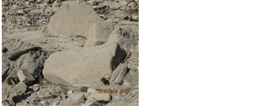 In our case, we do not have typical landslide events when it is brought into dynamics by increased “moisture effect” bringing down moving rocks to sliding consistency. In case of such a landslide, the inclination of the layers and that of the relief surface coincide, at where the interchange of slated clays with sandstones starts. They start gravitational movement in the first section under the block-crawl regime covering at around 300 meters where along with the movement significant quantity of sandstone blocks and fractured rocks remain on the slope (Figure 3). Further, up to Village Akhaldaba at approximately 700 meters it transfers into liquid-soft state below the village road where it appears in quite a deeply down cut gully of Jokhani Tskali. After appearing in the riverbed with a significant inclination, it transforms into a typical debrisflow movement regime, the rocks-muddy stone material hits with great energy on the bed of the Riv. Vere Gorge and congests it with short intervals increasing the level of Riv. Vere up to 3 - 4 meters, though it did not play a significant role in increasing the total flow. The flow leaves behind the rocks (Figure 4) and continues flowing in the Vere Gorge, mostly saturated with fine-grained fraction, which brings along the wooden materials brought down from the body of the landslide. This mix of water-mud-stones along with a large amount of the vegetation got down on the territory of the City. We consider that it was the vegetation mixed with the muddy mass which became a key reason of blocking the tunnels in the riverbed and leading to overflowing in the outer space of the riverbed, which caused such a big tragedy in the City claiming the lives of up to 20 persons, de-