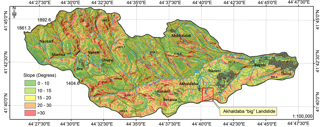 The Akhaldaba big landslide is developed on 40˚ - 50˚ inclination slope with the North- North/West exposition starting from its crescent and spreading up to environs of Village Akhaldaba (Figure 5 and Figure 6).